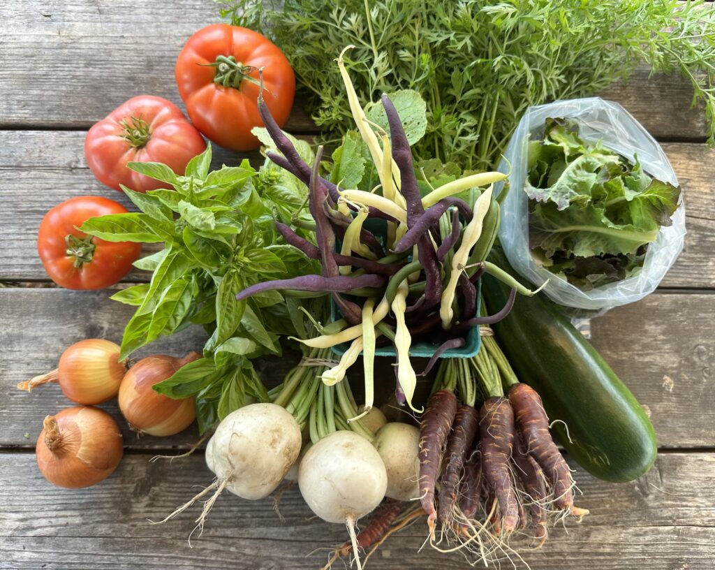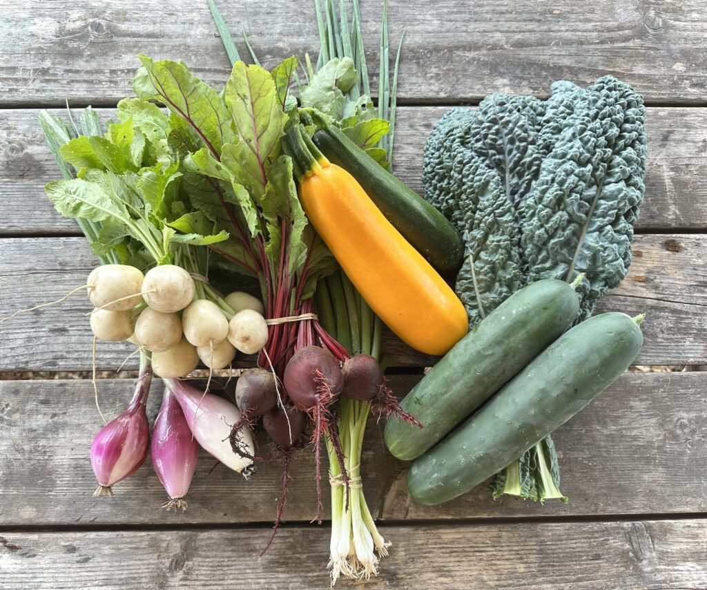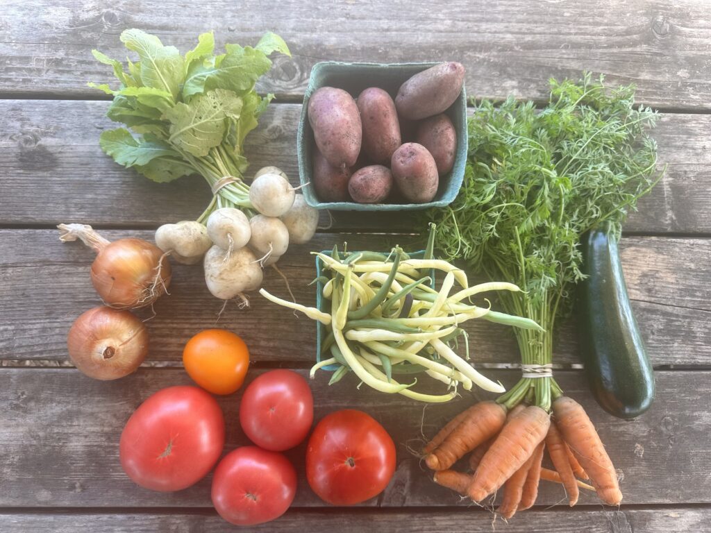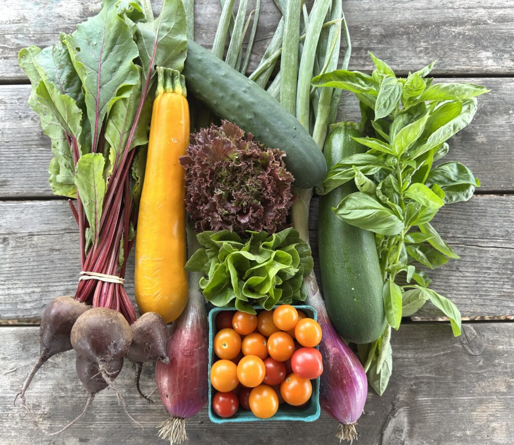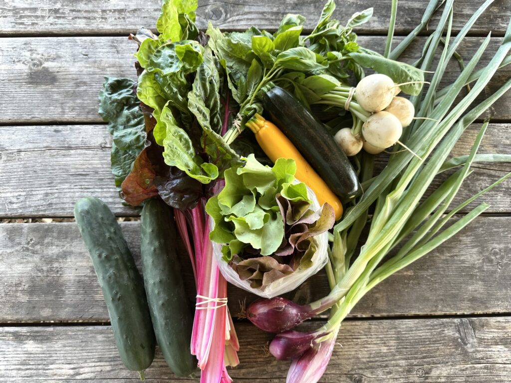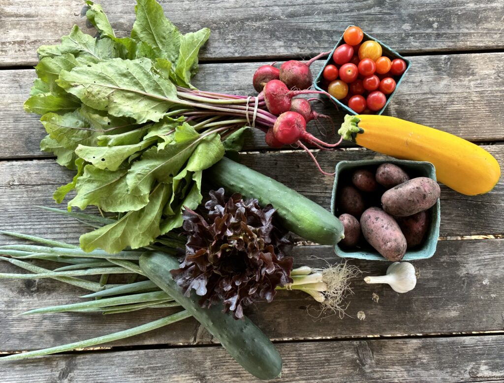 - Includes the bounty of late spring and early summer, including greens, sugar snap peas, salad mixes, radishes, turnips, and spinach, and moving into mid-summer crops like summer squash, cucumbers, eggplant and cherry tomatoes, supplemented occasionally by partner-farmer crops such as fruit, asparagus, and corn (depending on what is in season at the time).