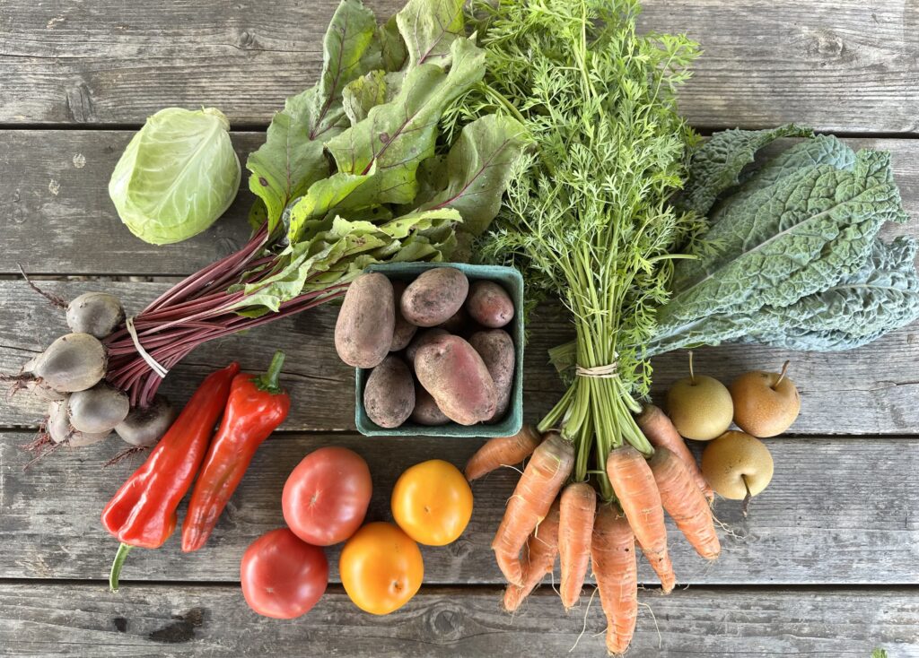 - Includes the bounty of late summer and early fall, starting with cherry tomatoes, eggplant, peppers, round, heirloom tomatoes, and melons, then transitioning to tender greens, salad mixes, hearty greens, winter squash, spinach, Asian pears and root vegetables, supplemented occasionally by partner-farmer crops such as asparagus and corn (depending on what is in season at the time).